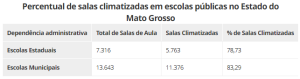 No total, o estudo analisou cerca de um milhão de salas de aula em todo o país. Apenas 372.033 possuem climatização. O percentual de salas de aula climatizadas no estado de Mato Grosso é de 78,73%, já o percentual nas escolas públicas do Brasil é de 33,99% .