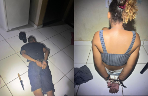 Ainda conforme a PM, um dos suspeitos foi localizado dentro da casa realizando chamada de vídeo com outros integrantes da facção, que participavam do interrogatório da adolescente. Com ele, os policiais encontraram uma faca na cintura. Próximo à vítima também foram apreendidos um facão e outra faca.